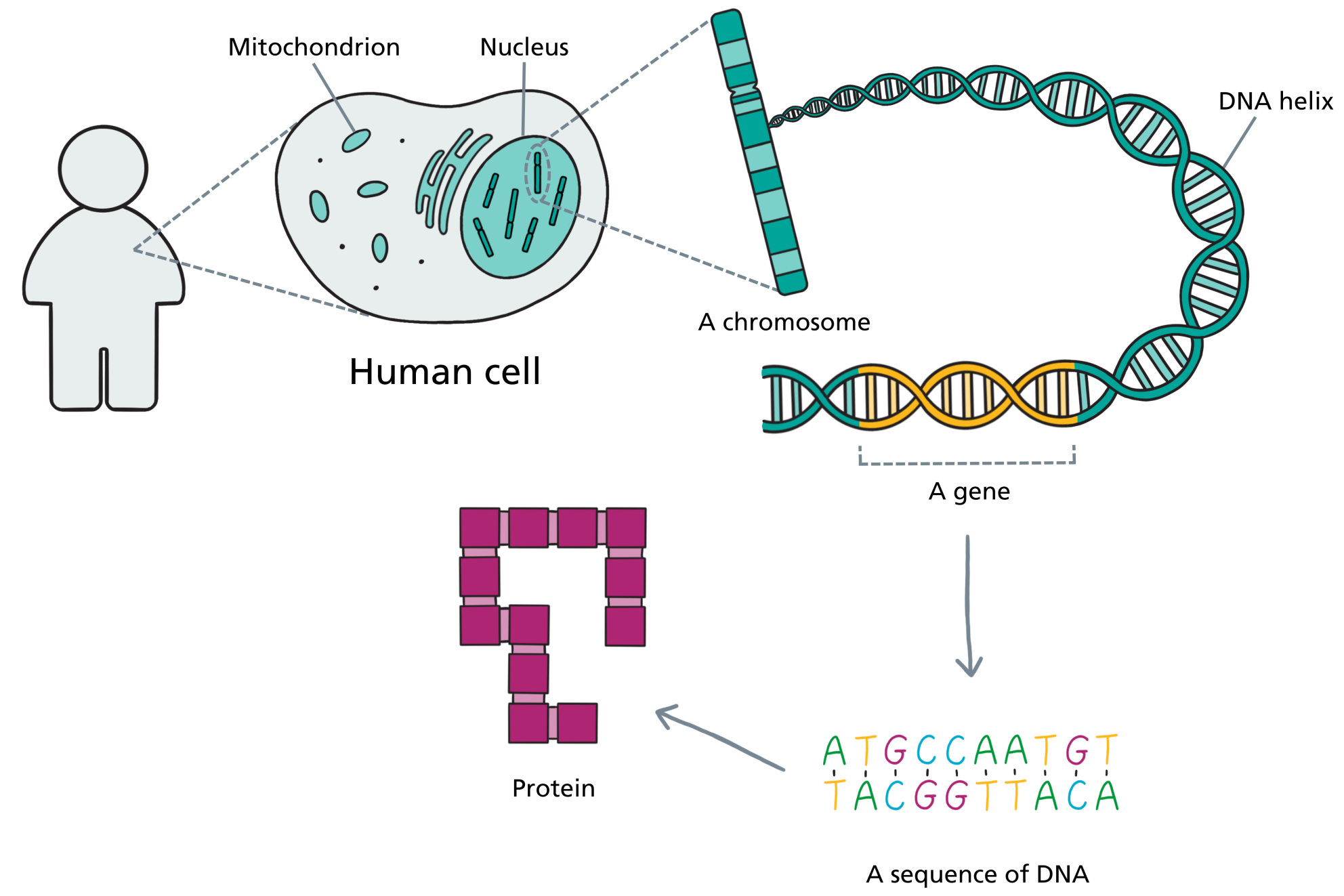 Every cell in your child’s body contains a nucleus, and inside that nucleus is the complete set of genetic instructions for building and running a human being. Those instructions are packaged into structures called chromosomes. Zoom in further and each chromosome is made of a long, tightly coiled molecule of DNA. Zoom in further still and you reach the level of individual genes: specific stretches of DNA that each carry the instructions for making a particular protein. And at the finest level of all, those instructions are written in a sequence of chemical letters – A, T, G, and C – strung together in a precise order.