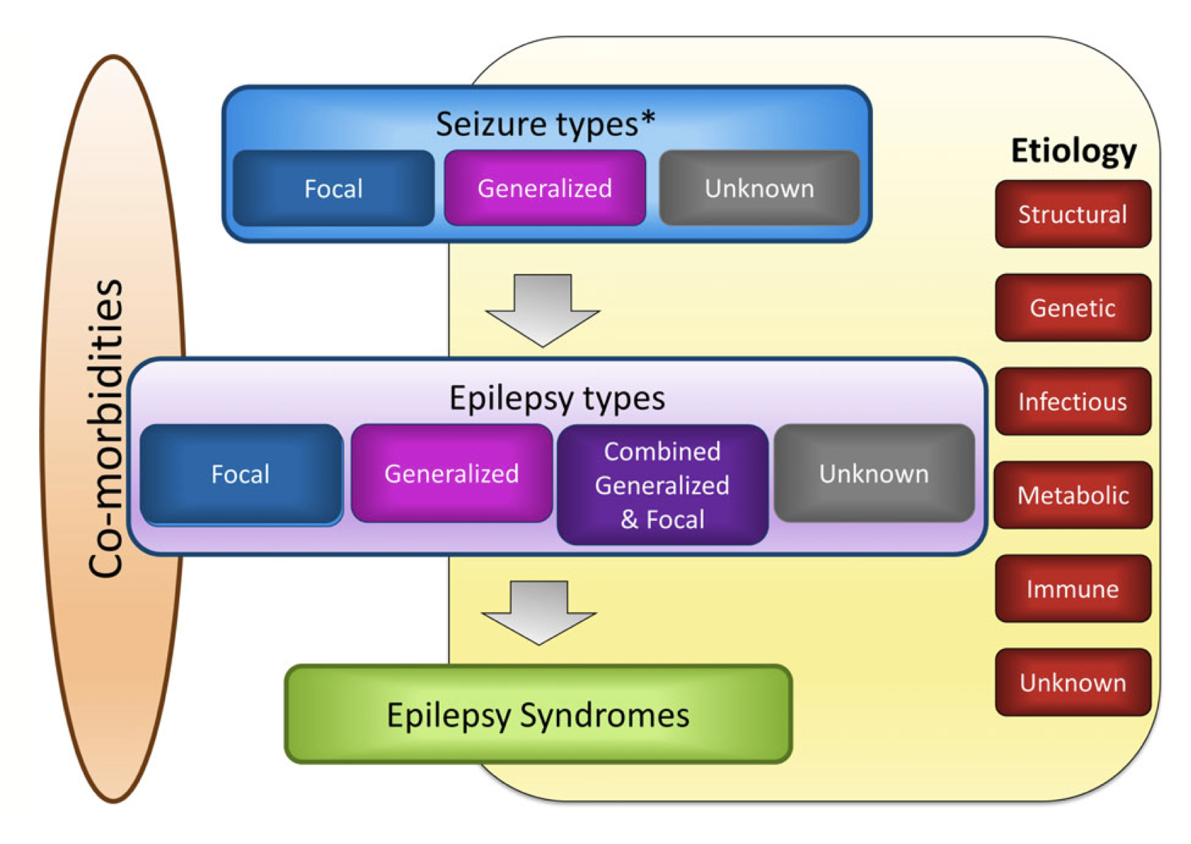 The second level is the type of epilepsy - focal epilepsy (seizures arising consistently from one part of the brain), generalized epilepsy (seizures involving both hemispheres from the start), combined focal and generalized epilepsy, or unknown.